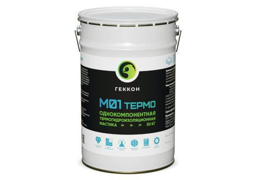 Геккон М01 Термо - Однокомпонентная полиуретановая композиция, отверждаемая под воздействием естественной влажности воздуха, специальные свойства которой обусловлены применением полых разно размерных стеклянных сфер и наноразмерных минеральных частиц с модифицированной поверхностью. Поставляется в комплекте с ускорителем полимеризации, который вводится в композицию с целью ускорения процесса пленкообразования в диапазоне 0,5-1% от общего объема, непосредственно перед началом работ по нанесению материала. После высыхания образует прочное эластичное покрытие с высоконаполненной микропористой структурой, обладающее теплозащитными и гидроизоляционными свойствами.